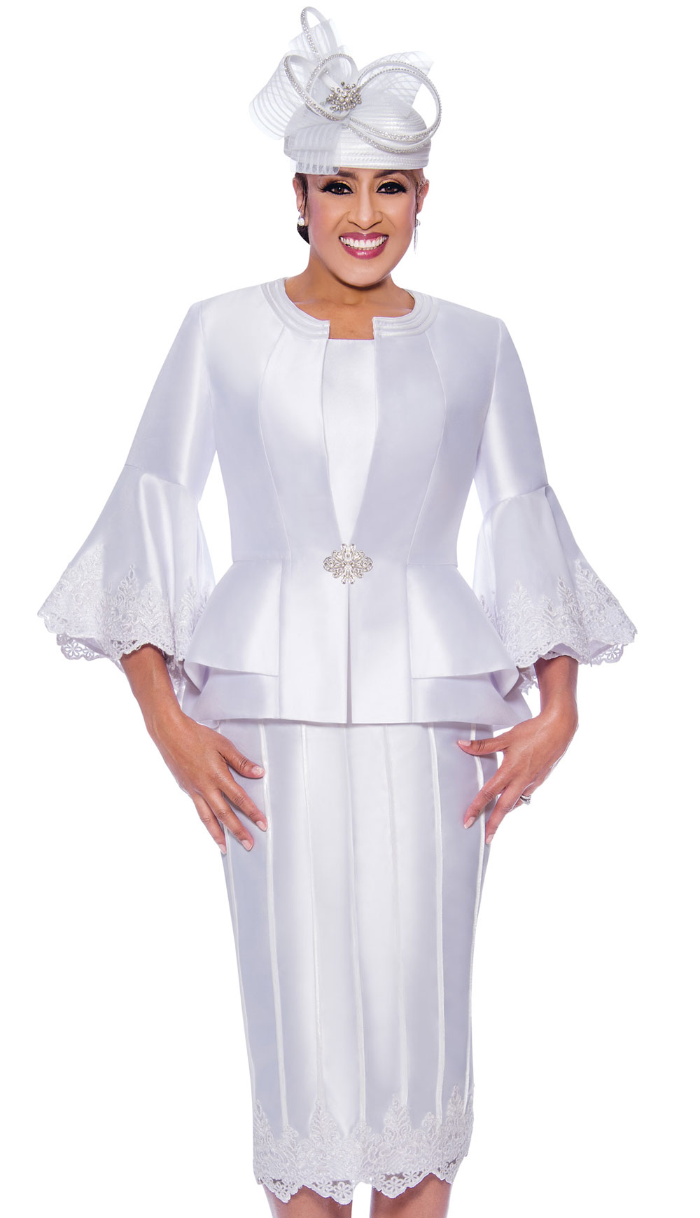 Style: Dorinda Clark Cole 9053-WH ( 3pc Silk Womens Church Suit With Flared Lace Sleeves And Jacket )-Hat