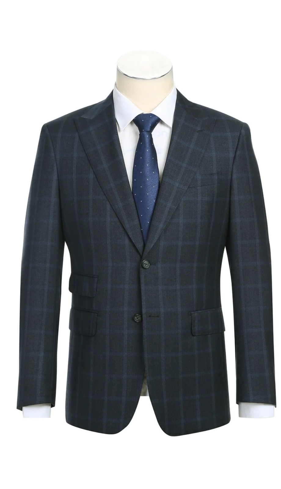 Peak lapels; Two button closure; Side vents; Lined
