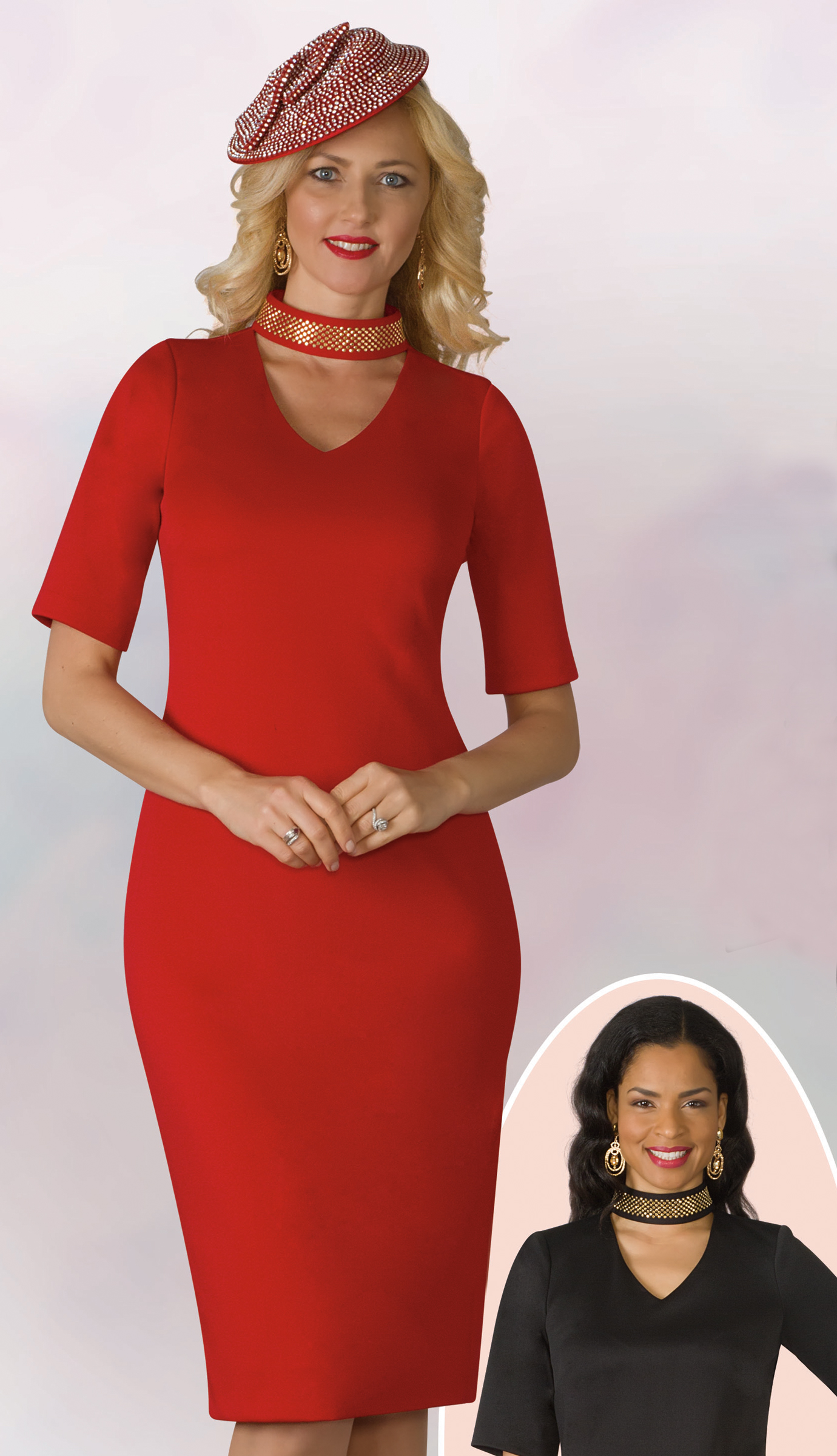 Style: Lily And Taylor 4158-RE ( 1pc Knit Womens Church Dress With Vee Neckline Ponte And Beaded Necklace )-Hat