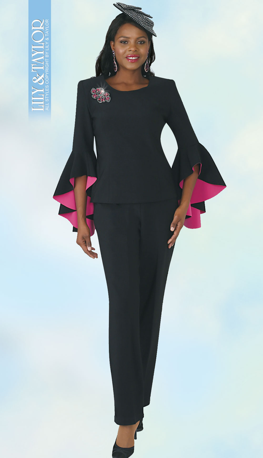 Style: Lily And Taylor 4381-BL ( 2pc Ladies Knit Church Pant Suit With Colored Interior Bell Sleeves ) - Hat