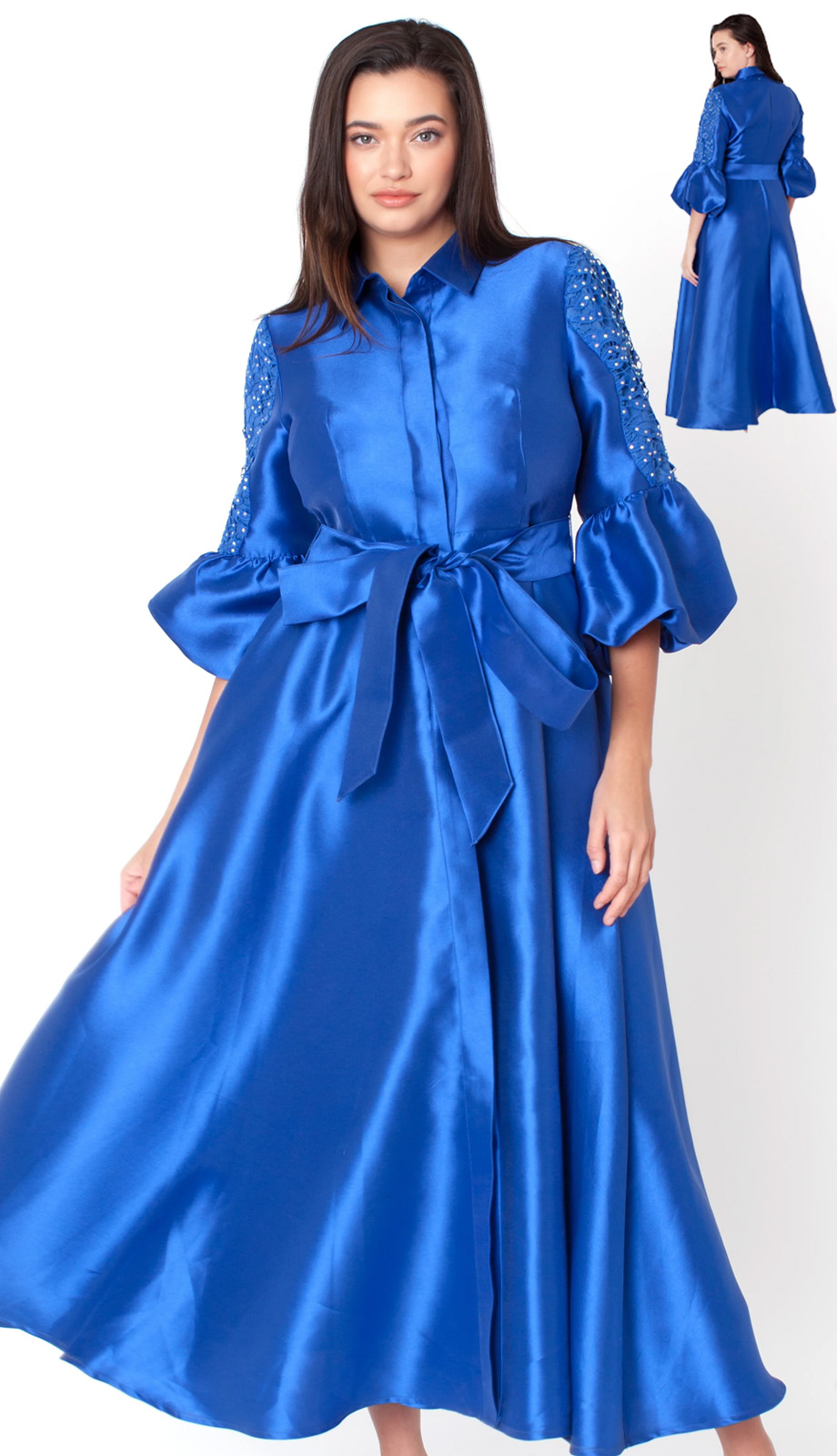 - Featuring Classic Button-Front Collar, Dramatic Bishop Sleeves With Delicate Graceful Embellishment And Flattering Tie Waist