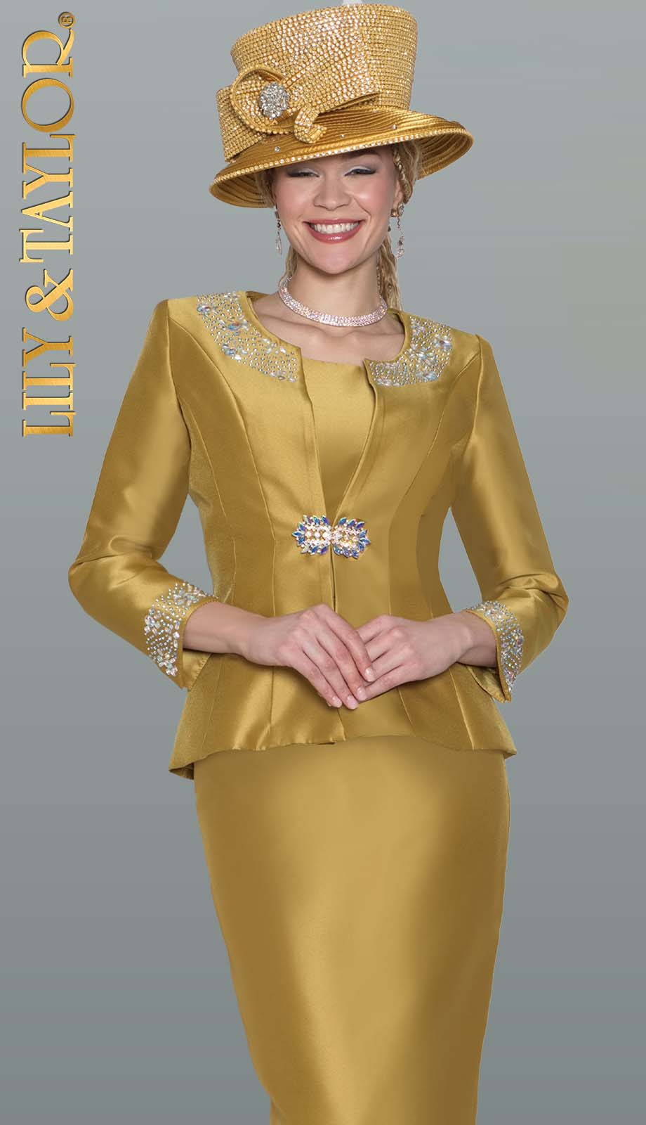 - 3pc Silky Twill Skirt Suit With Rhinestone Neckline And Sleeve Trim