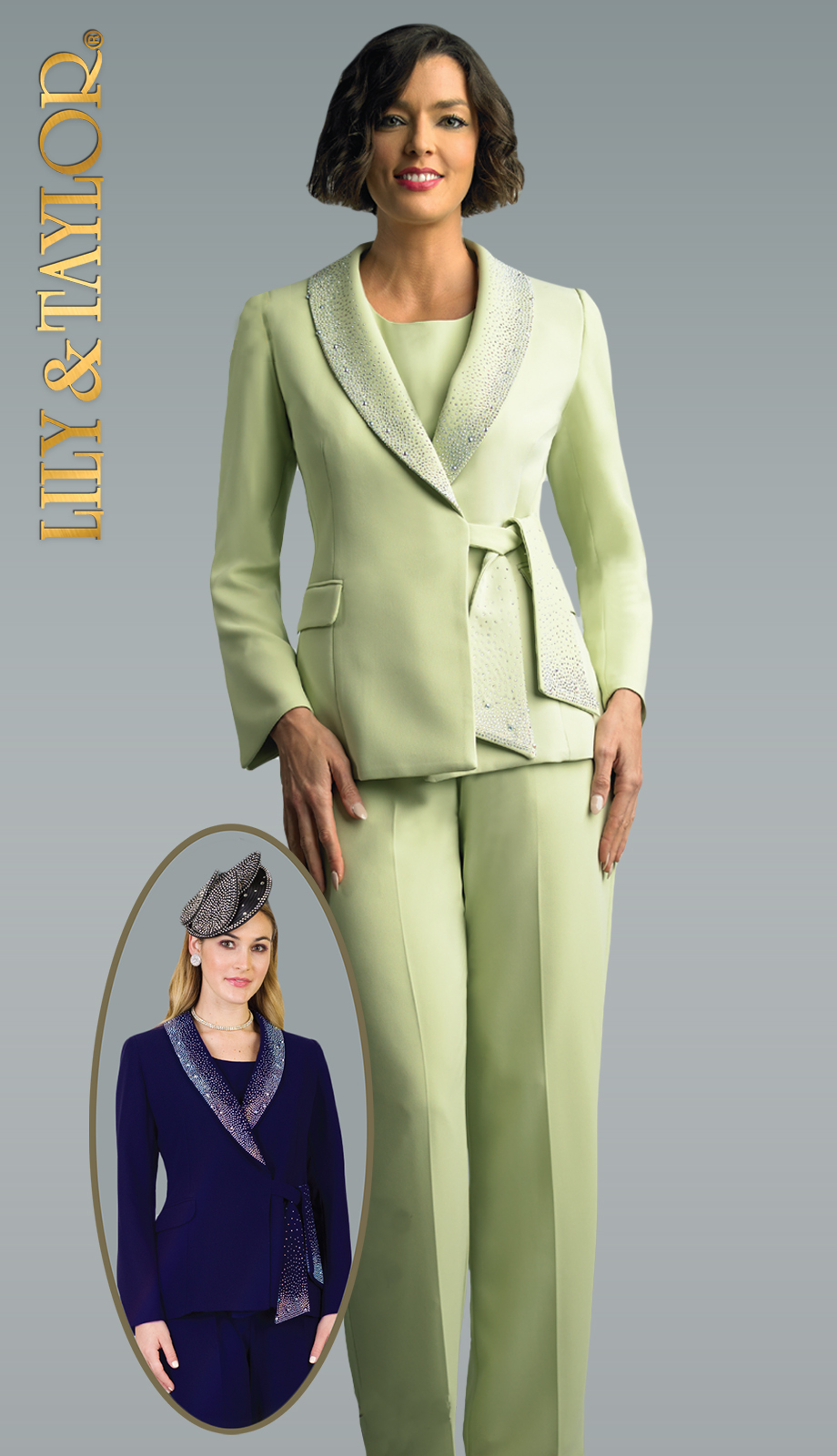 Style: Lily And Taylor 4373-OLI-QS ( 3pc Ladies PeachSkin Pant Suit With Rhinestone Collar And Trim )