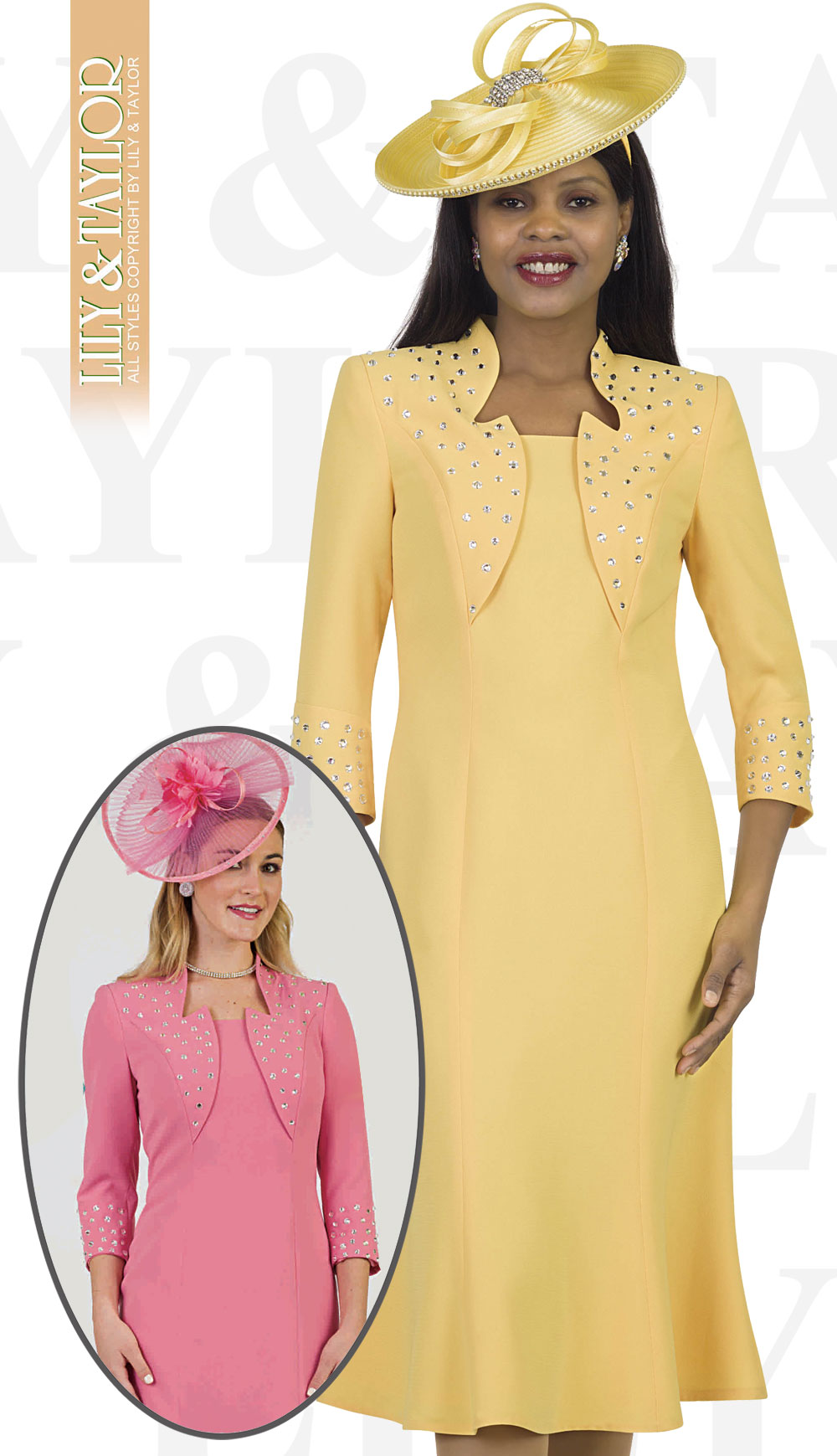 Style: Lily And Taylor 4502-YE ( 1pc Crepe Womans Church Dress With Jeweled Trim Sleeves And Collar )-Hat
