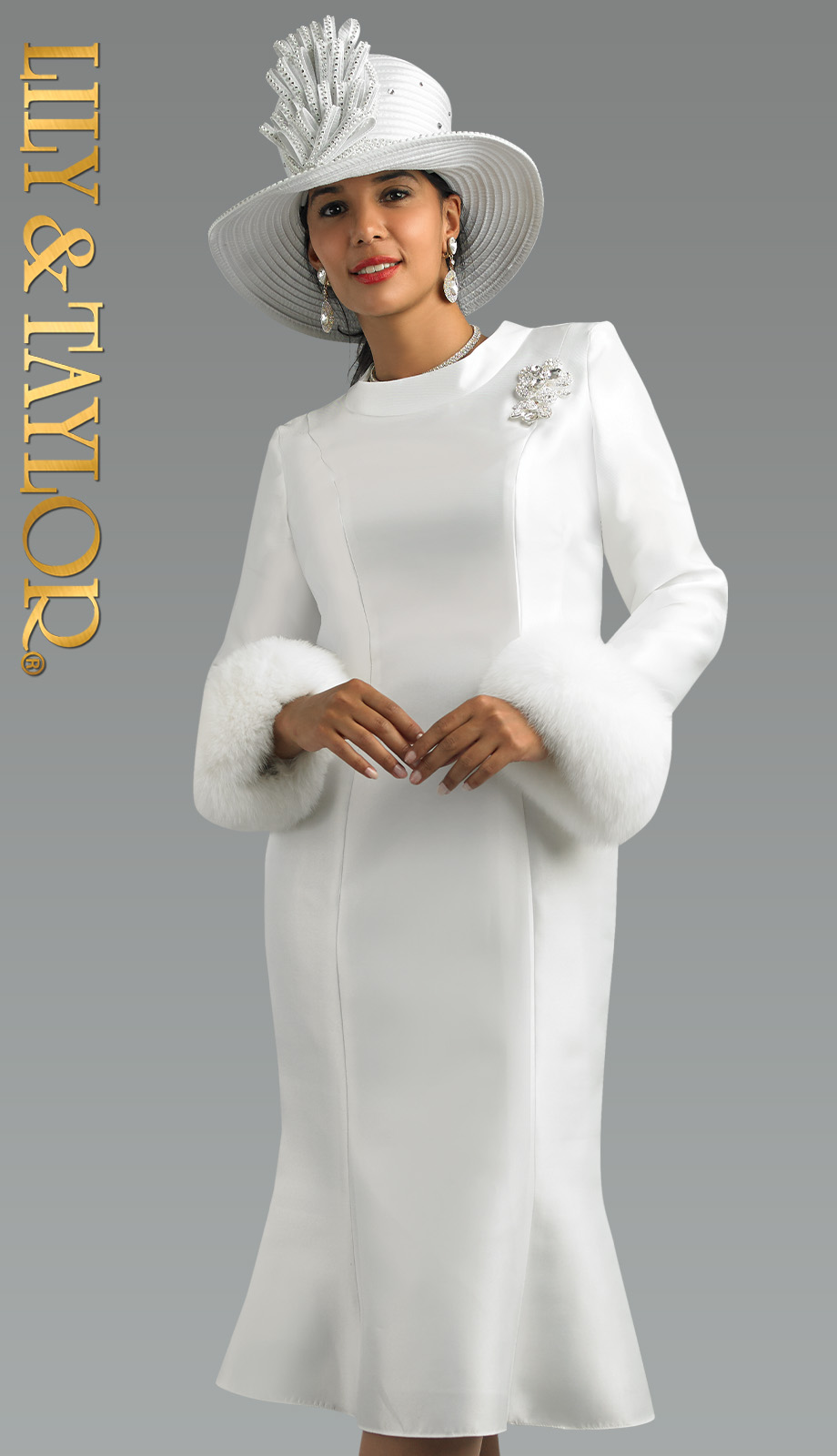 - 1pc Silky Twill Dress With Removable Genuine Fox Fur Cuffs And Rhinestone Brooch