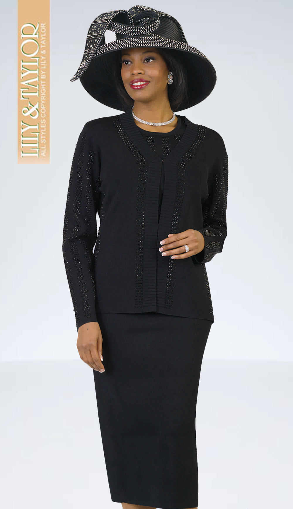 Style: Lily And Taylor 651-BLK ( 3pc Knit Womans Church Suit With Rhinestones )-Hat