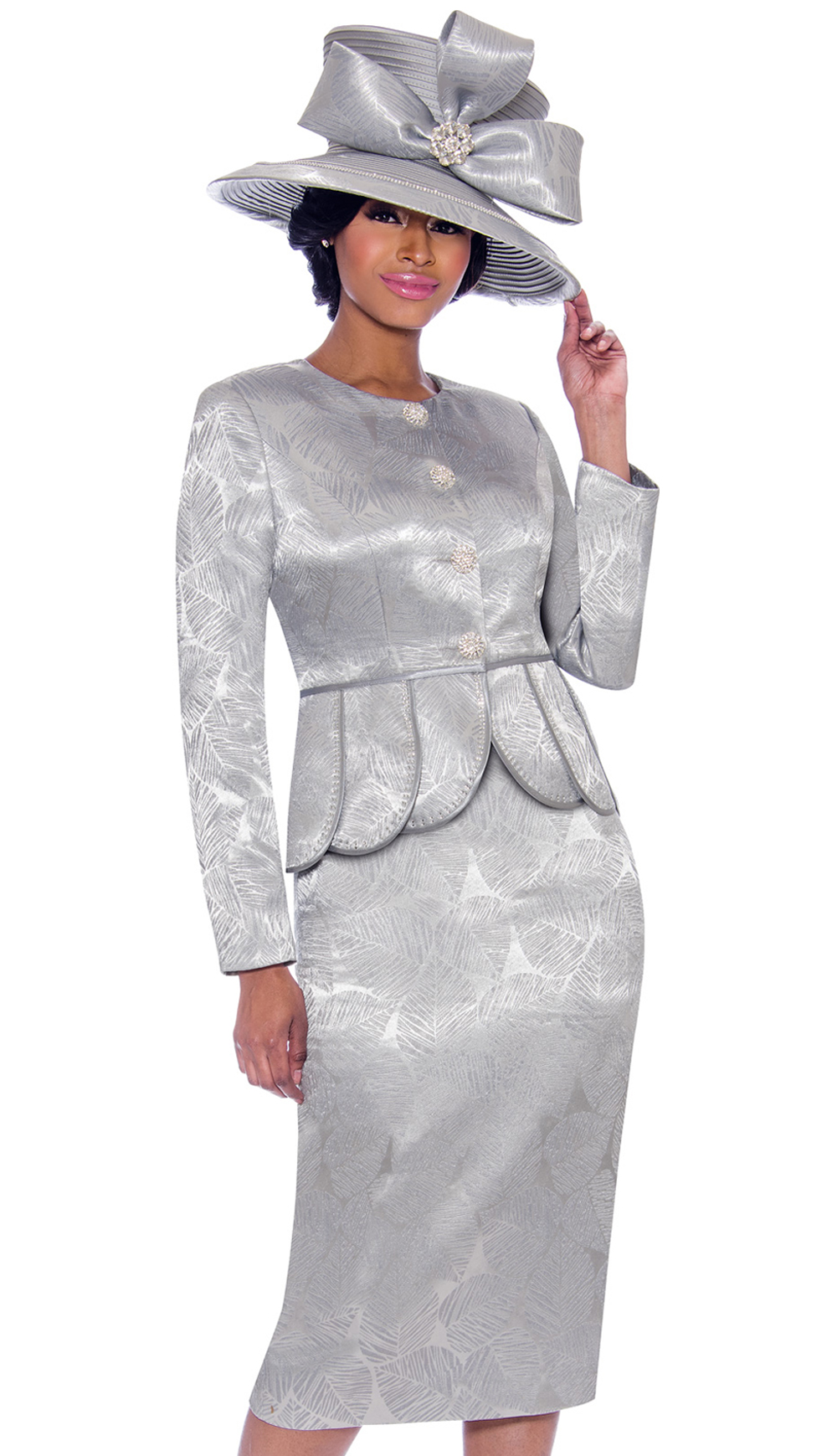 Style: Terramina 7790-SI ( 2pc Brocade Womens Skirt Suit With Scallop Trim Jacket In Leaf Imprint Design Fabric )-Hat